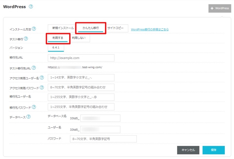 - 移行元パスワード:移行するWordPressサイトのパスワード