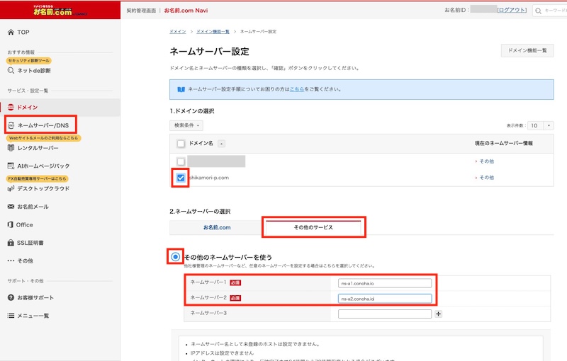 ドメインサービス(ここではお名前.comの例)のネームサーバー設定を変更します。